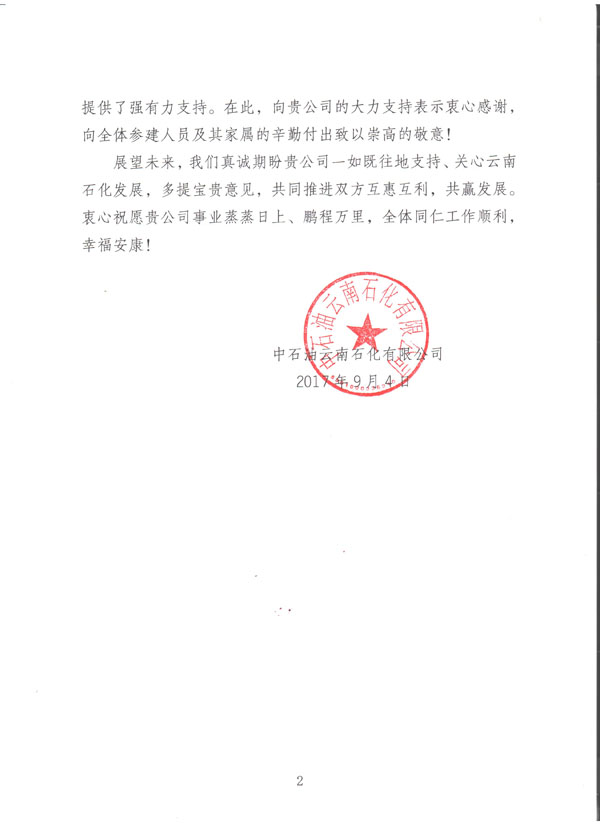 我公司于今日收到由中國(guó)石油云南石化有限公司發(fā)給我方的《感謝信》一封,信中提到:對(duì)于我方所監(jiān)理服務(wù)的煉油項(xiàng)目自2006年啟動(dòng)籌備工作至今,我方監(jiān)理人員不計(jì)利益得失,勇于承受壓力,使得該項(xiàng)目近日順利投產(chǎn)試車成功。對(duì)于我單位的工作給予極大的肯定以及衷心的感謝。對(duì)方還提到:希望雙方在日后的共同發(fā)展中,互惠互利,共贏發(fā)展。