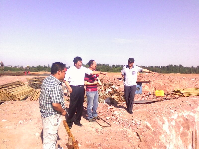 七月八日公司領(lǐng)導(dǎo)來騰格里項目視察,總經(jīng)理孫學(xué)良(左二)等公司領(lǐng)導(dǎo)在水源地泵站詢問進(jìn)展工程情況